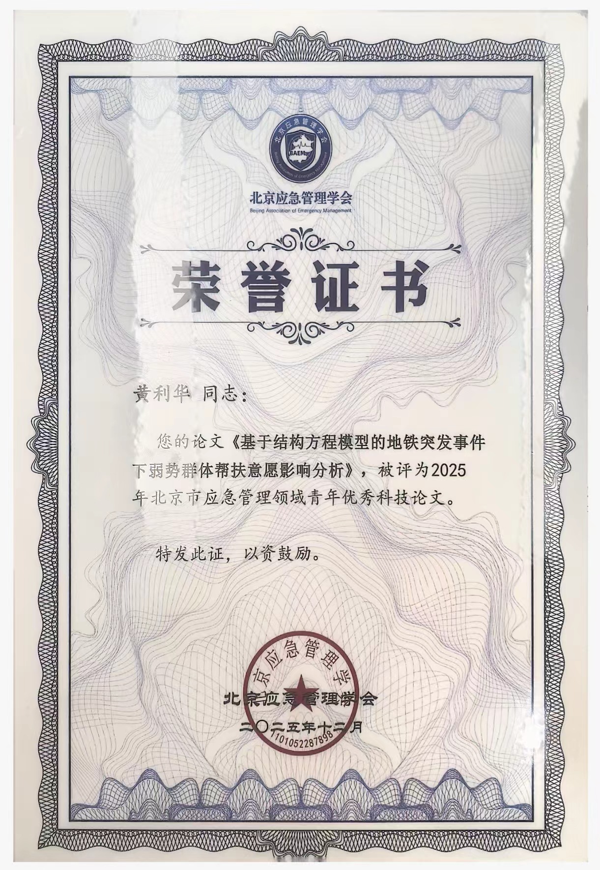 管理工程学院黄利华副教授成果获评2025年北京市应急管理领域青年优秀科技论文