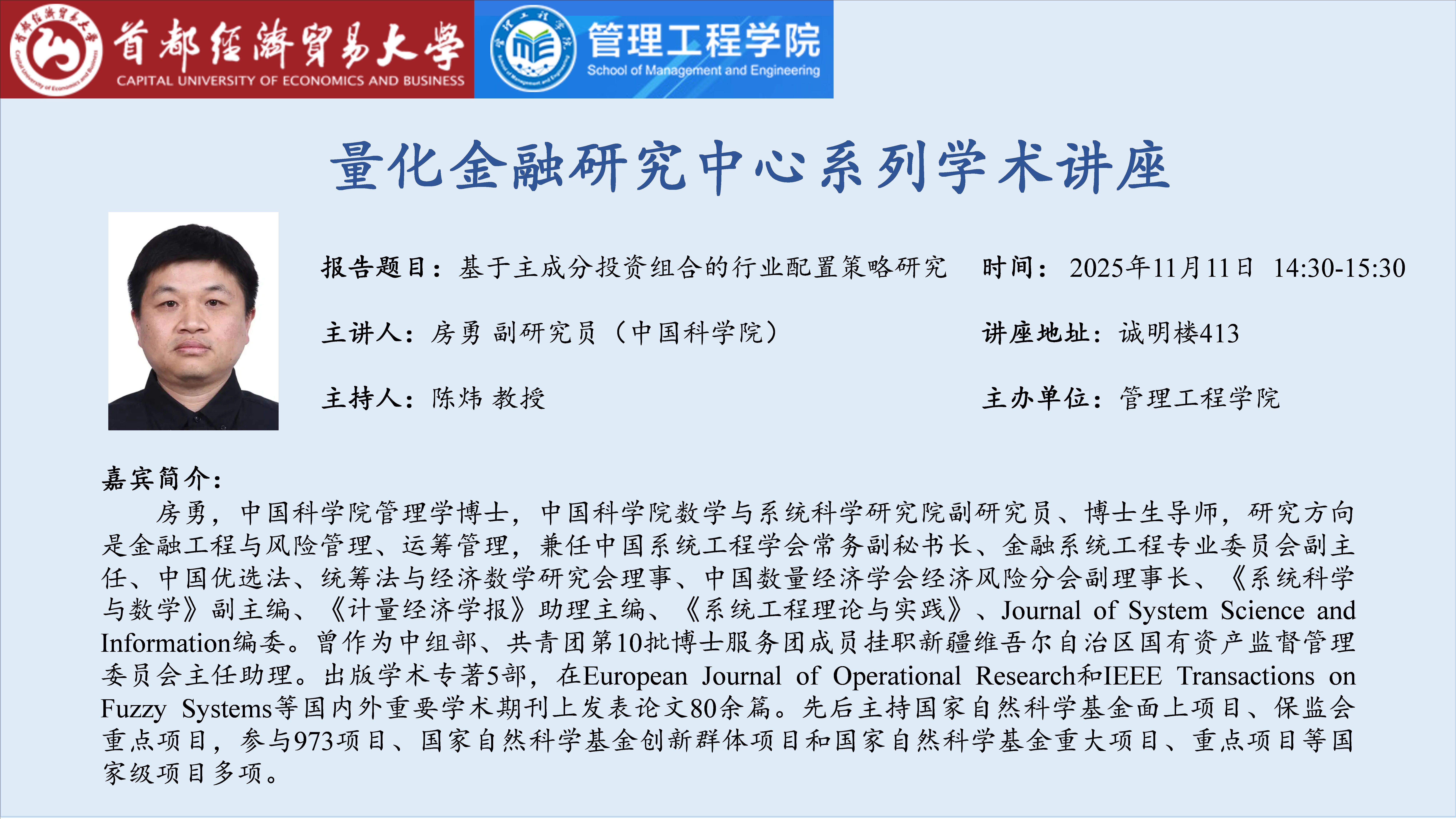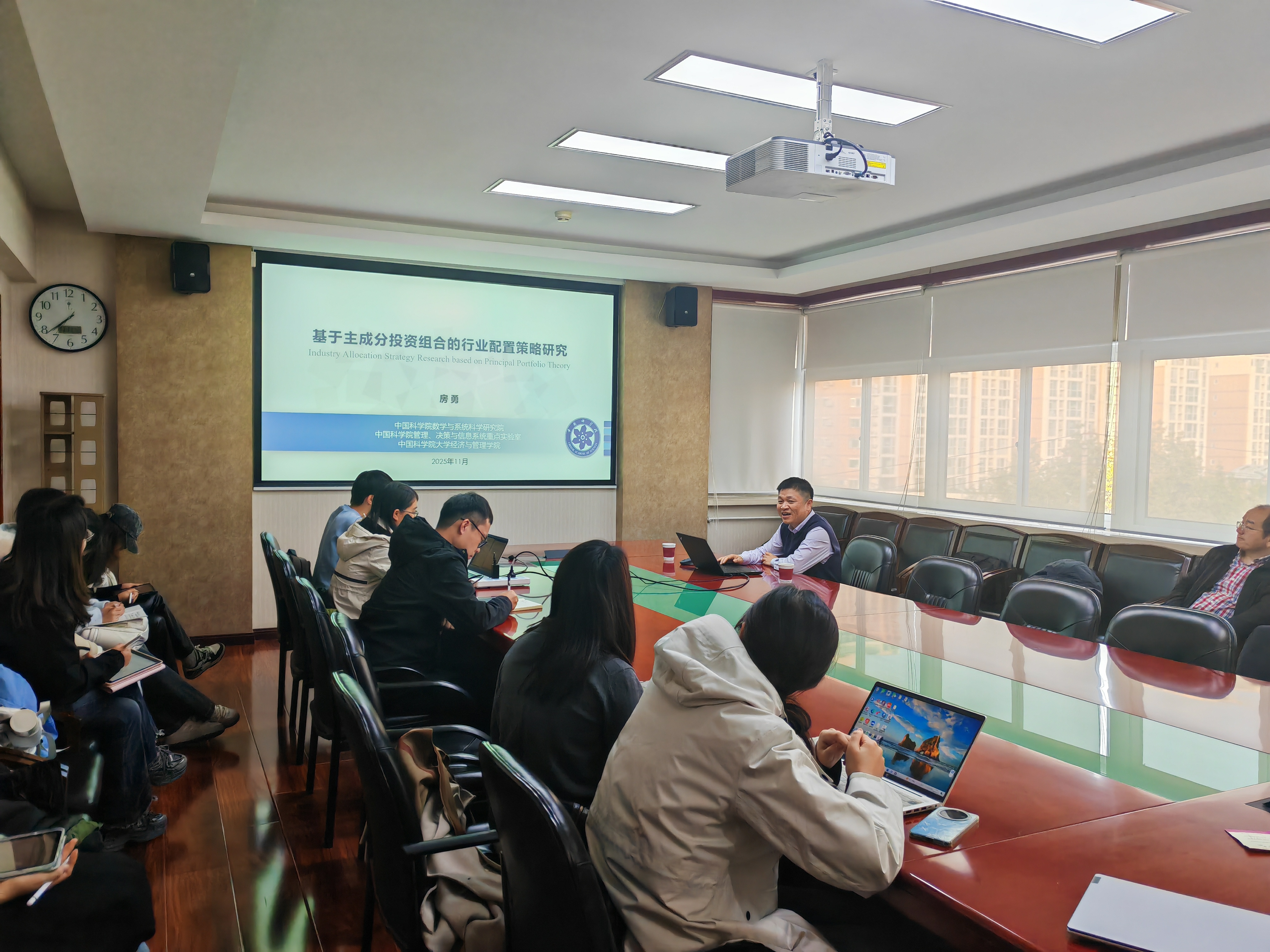 2025年11月11日下午,中国科学院数学与系统科学研究院房勇副研究员在诚明楼413会议室作了题为“基于主成分投资组合的行业配置策略研究”的学术讲座。本次讲座由首都经济贸易大学管理工程学院量化金融研究中心主办,研究中心多位教师及硕博研究生共同参与。