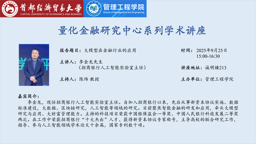 9月25日下午,招商银行人工智能实验室主任李金龙先生应邀在诚明楼213会议室为师生带来了题为“大模型在金融行业的应用”的讲座。本次讲座由首都经济贸易大学管理工程学院量化金融研究中心主办,吸引了中心多位教师及硕博研究生的积极参与。