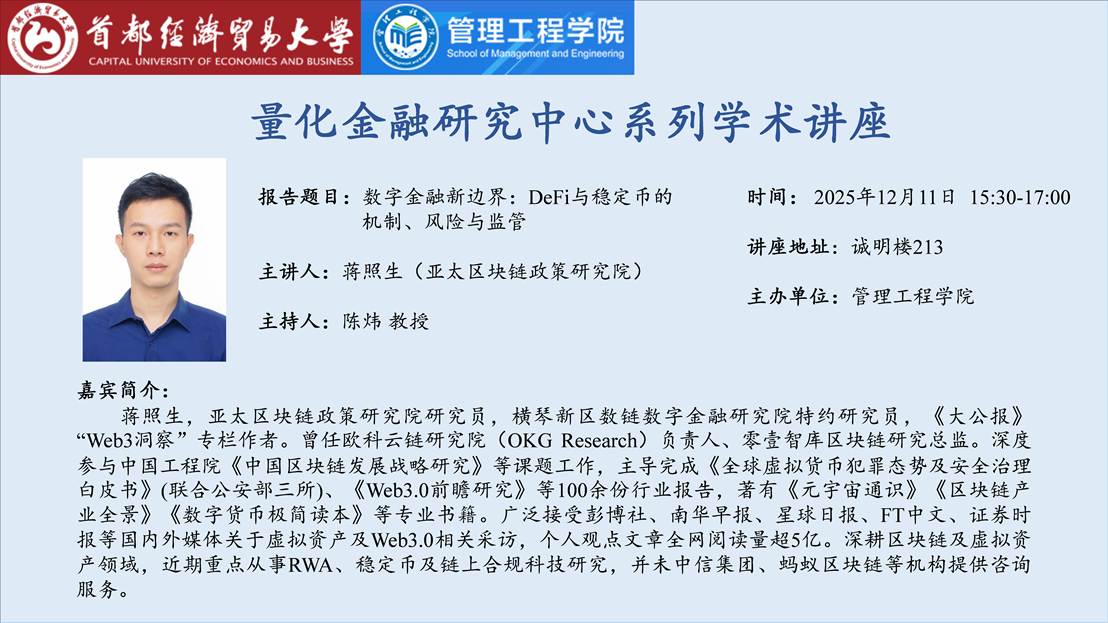 2025年12月11日下午,亚太区块链政策研究院研究员蒋照生先生应邀在诚明楼213会议室作题为《数字金融新边界:DeFi与稳定币的机制、风险与监管》的学术讲座。本次讲座由首都经济贸易大学管理工程学院量化金融研究中心主办,吸引了研究中心多位教师及硕博研究生参与。
