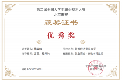 学院围绕生涯教育主线,推进“招生—培养—就业”联动机制,学院2022级大数据科学与技术专业本科生陈菲然获全国大学生生涯规划大赛北京市赛中获就业赛道铜奖,2022级计算机科学与技术专业本科生钱天鹤获优秀奖,2023级计算机科学与技术本科生丁邵帅获成长赛道优秀奖,实现了参赛覆盖率超过60%,形成“以赛促学、以赛促练、以赛促就”的良好氛围,推进在校生将生涯发展理念与学科认知、专业学习、实习实训深度融合,让在校生设计自己的生涯发展路径,将精准生涯指导覆盖“从入学到毕业”的全过程。