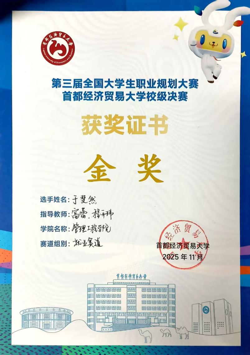 在本次职业规划大赛校赛中,管理工程学院收获颇丰。除于斐然同学斩获就业赛道本科生组金奖外,就业赛道徐艾琪、尹伊同学分别荣获了校赛研究生组的二等奖和三等奖;成长赛道上,白静怡同学荣获校赛二等奖,陈思彤、宋嘉馨同学荣获校赛三等奖。