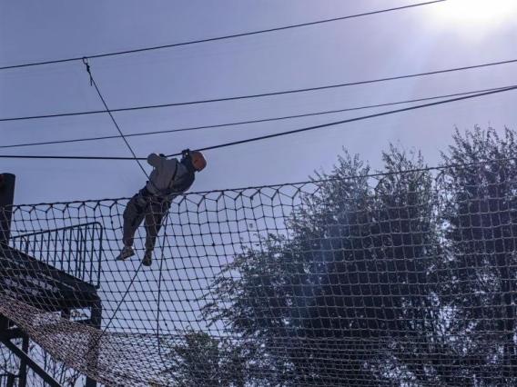 在指导员的专业指导与安全防护下,支部党员和积极分子沉浸式体验了消防员专项体能训练项目:在攀爬高斜坡项目中学习借助绳索掌握发力技巧,保持平衡的同时向上攀爬,深刻感受到了力量与技巧结合的救援要求;在滑索移动项目体验了空中跨越障碍的高效移动方式,切实感受到了消防训练对“速度”与“精准”的严格标准。