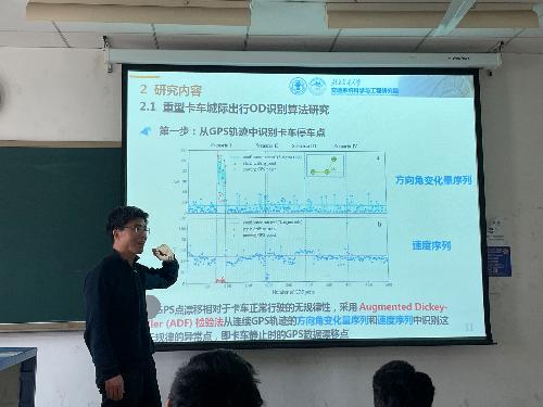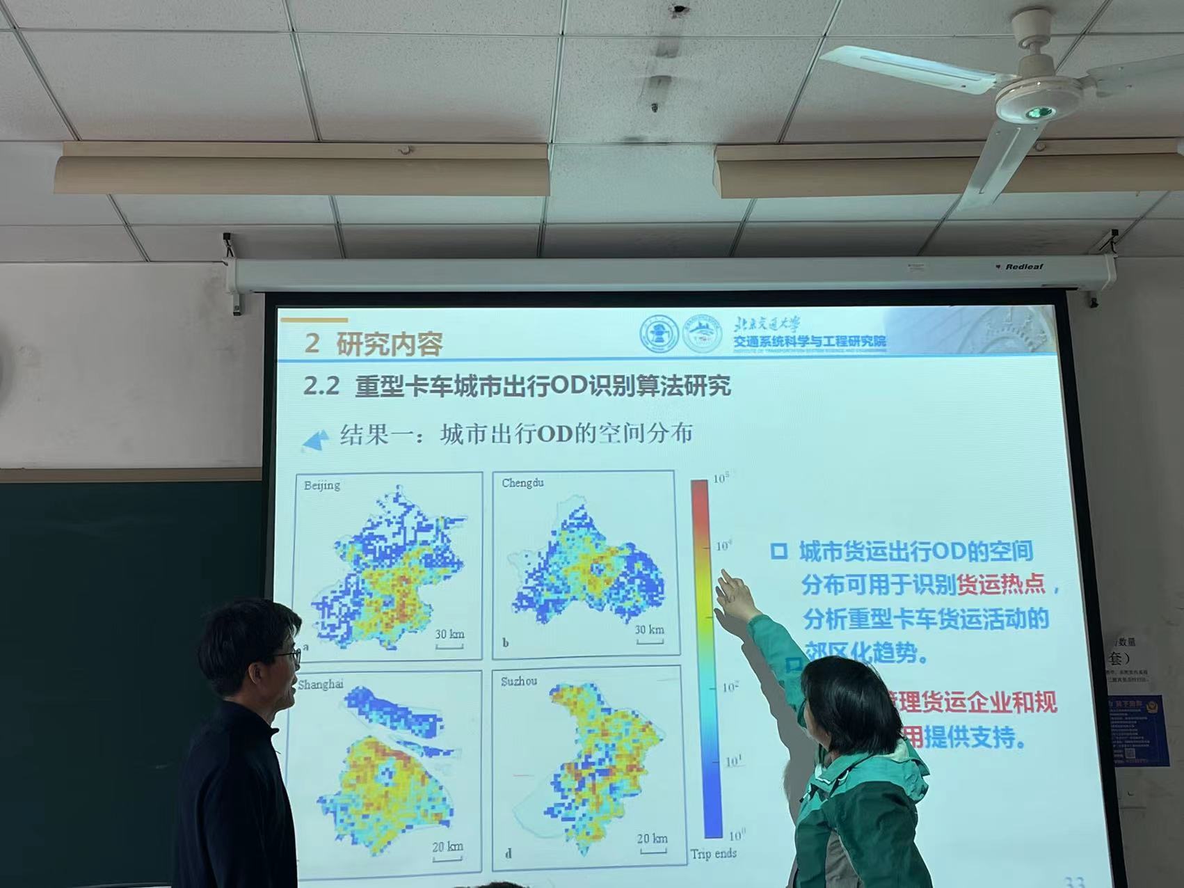 贾斌教授从重型卡车城际出行OD识别算法、城市出行OD识别算法以及城市重型卡车移动网络结构与演化三个方面,给参会人员进行了深入浅出的讲解。首先,以全国520万辆重型卡车数据,对重型卡车城际出行OD进行识别。从GPS轨迹中识别卡车停车点,结合GPS数据漂移点和速度为0的点找出每辆卡车的所有停车点,然后统计停留时间的分布,发现其服从分段幂律分布,体现了三类货运活动的时间特征。接下来借助货运相关的POI数据和道路网络数据,从卡车停车点中识别出有效的出行OD点。随机选取了1000辆重型卡车进行验证,结果表明所提出的新算法识别精度有显著提升。