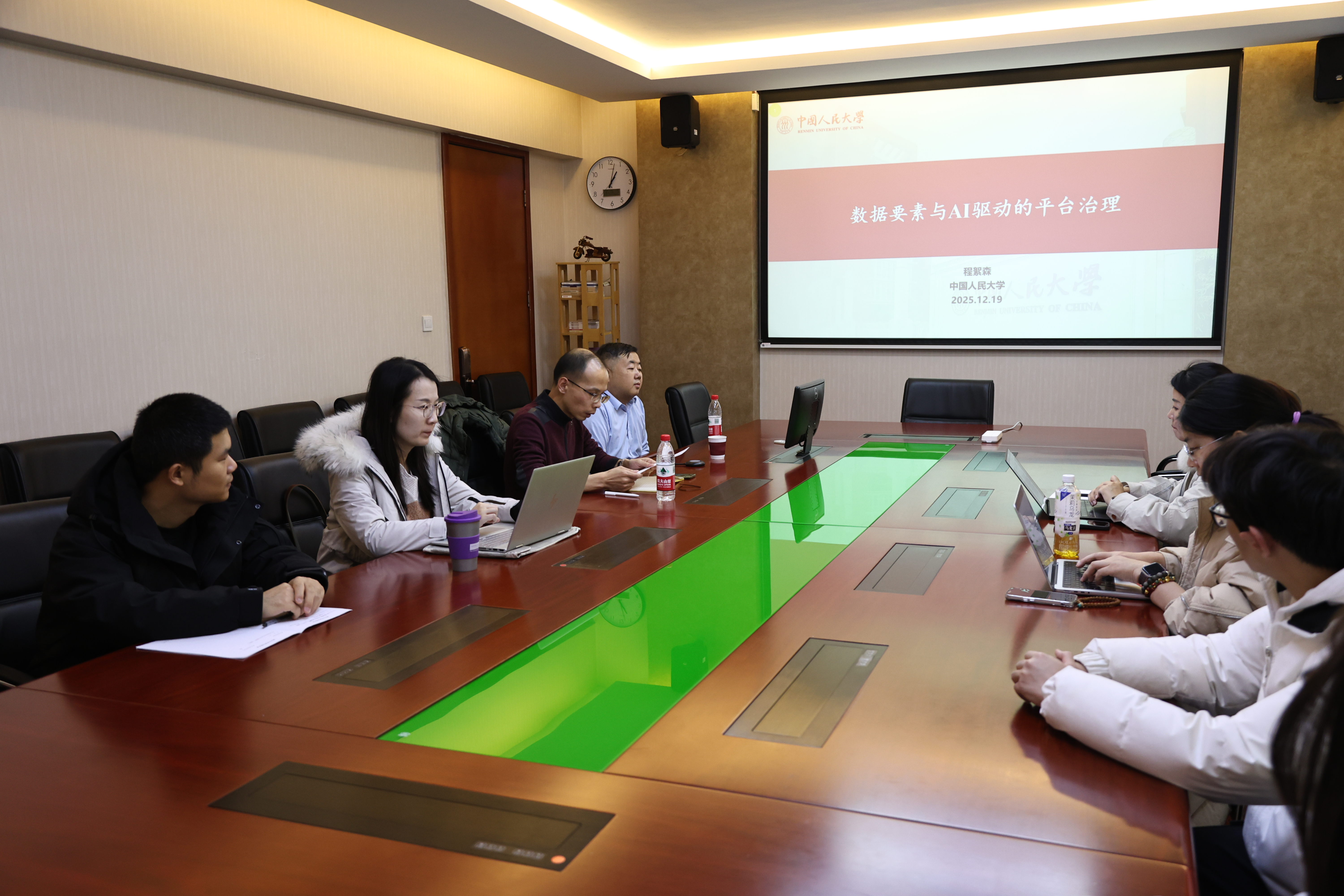 2025年12月19日下午,中国人民大学程絮森教授应邀为我院师生作了题为“数据要素与AI驱动的平台治理”的学术报告。报告会在诚明楼213会议室举行,学院部分青年教师和研究生参加报告会。会议由副院长胡磊主持。
