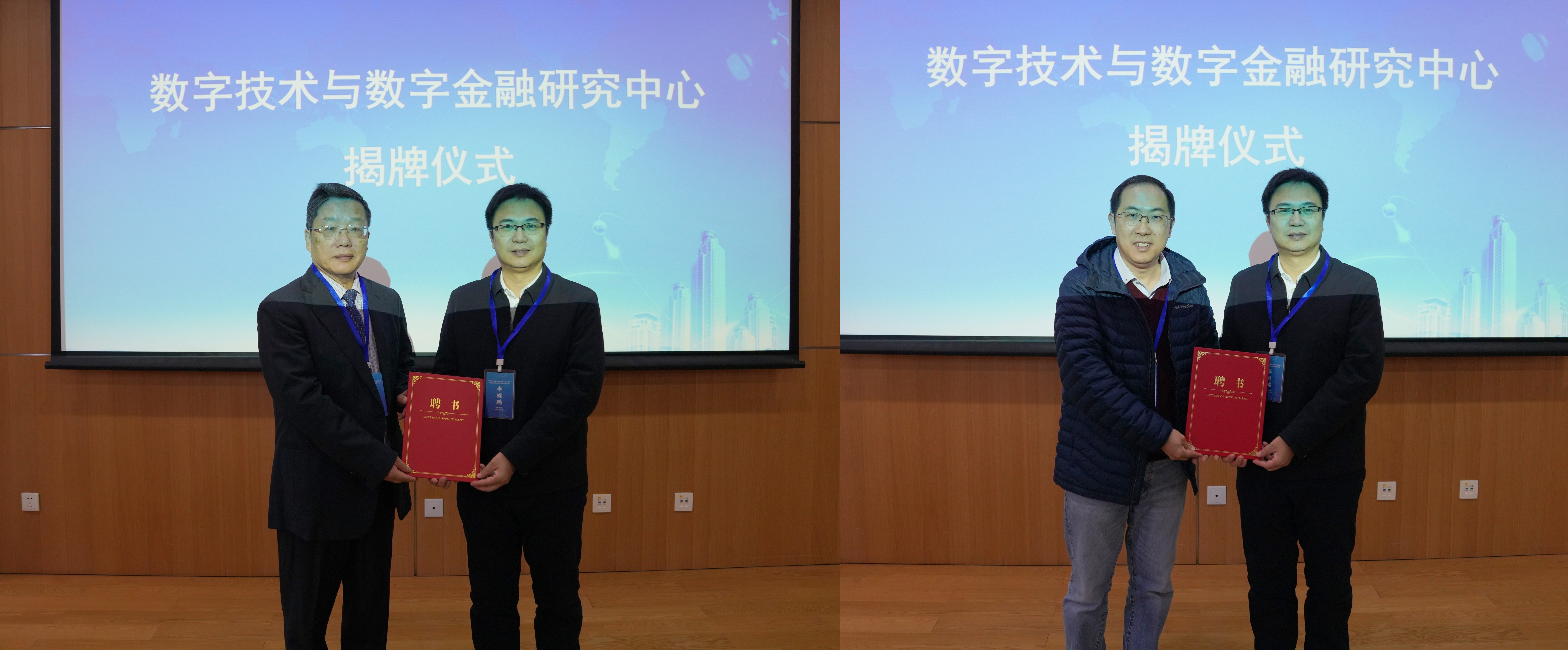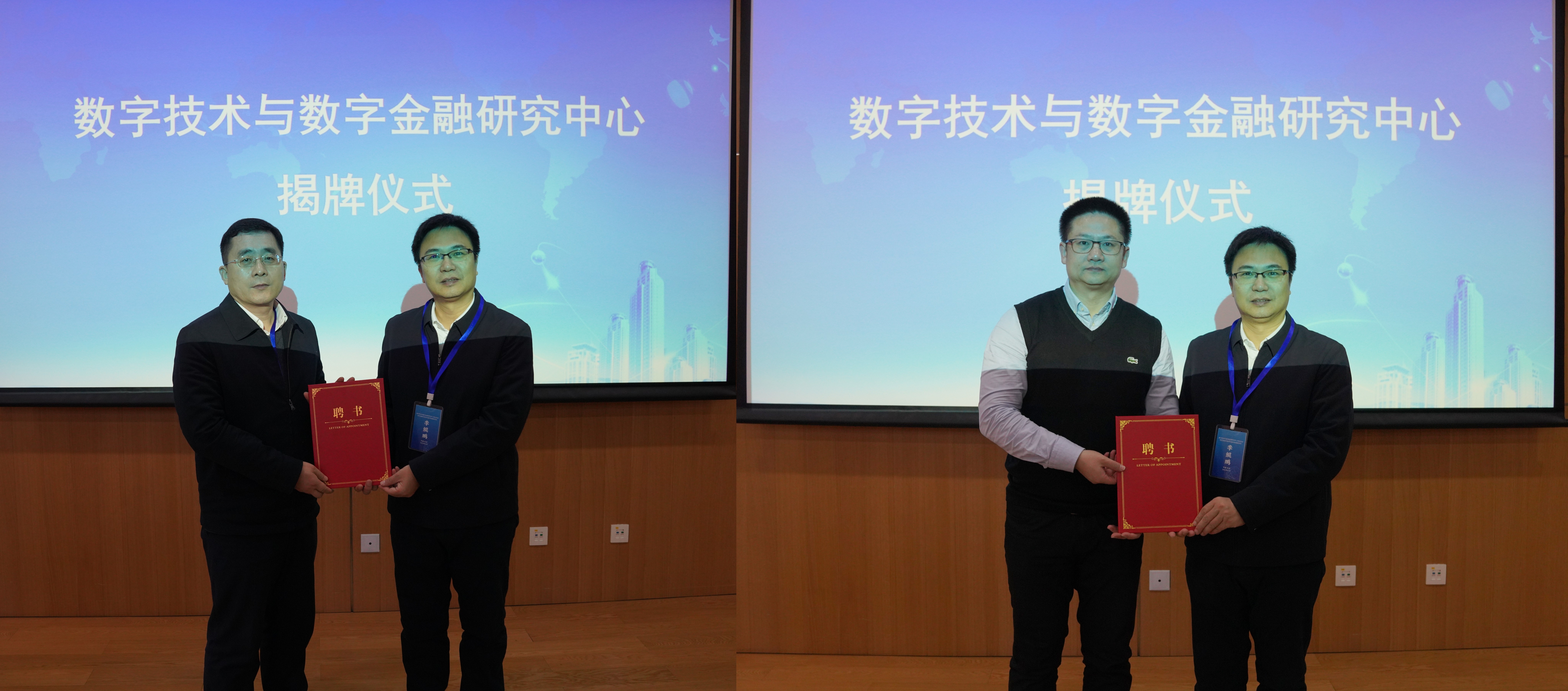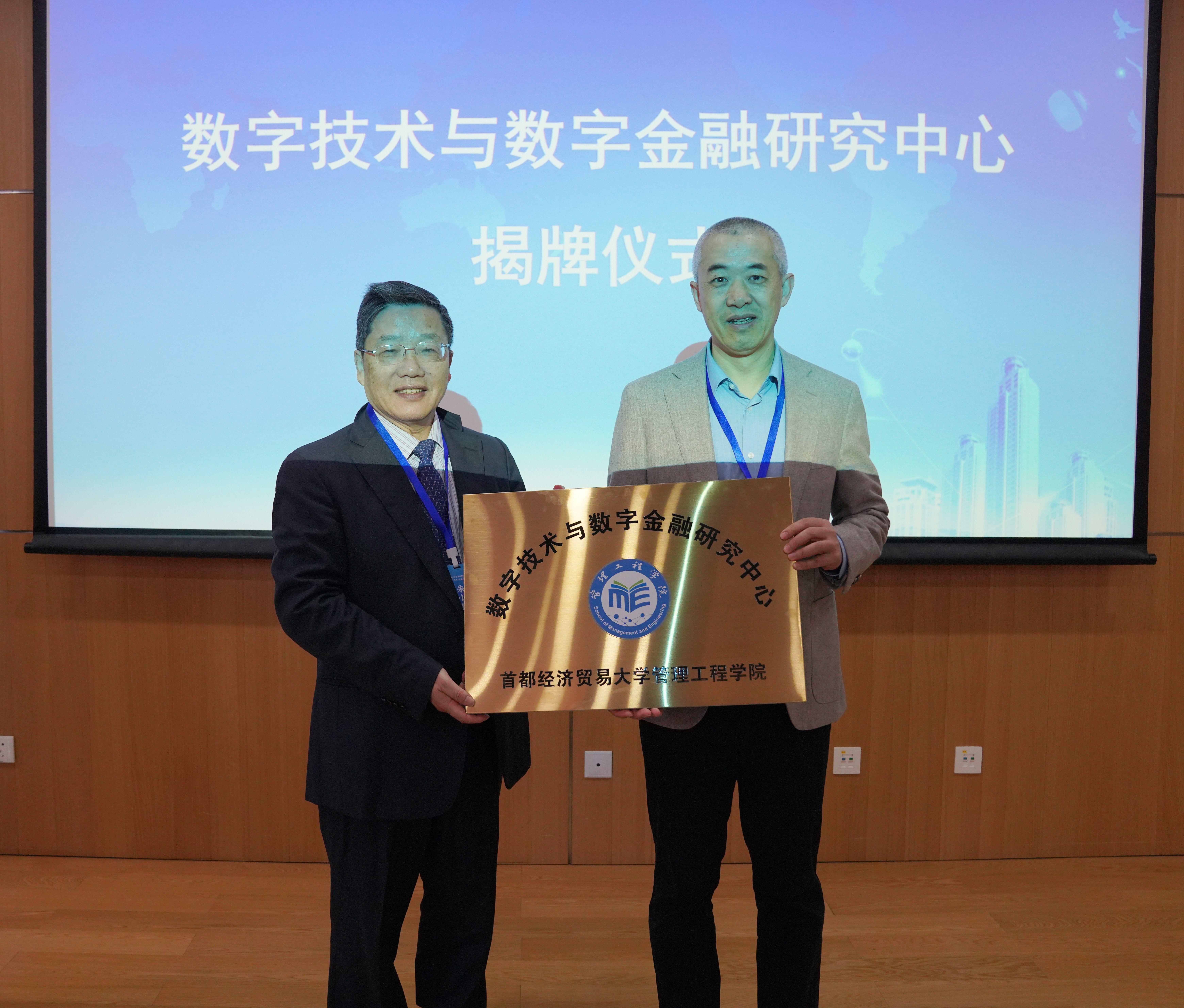 朱小黄为“首都经济贸易大学管理工程学院数字技术与数字金融研究中心”揭牌,李鲲鹏为研究中心学术委员会委员代表颁发聘书。