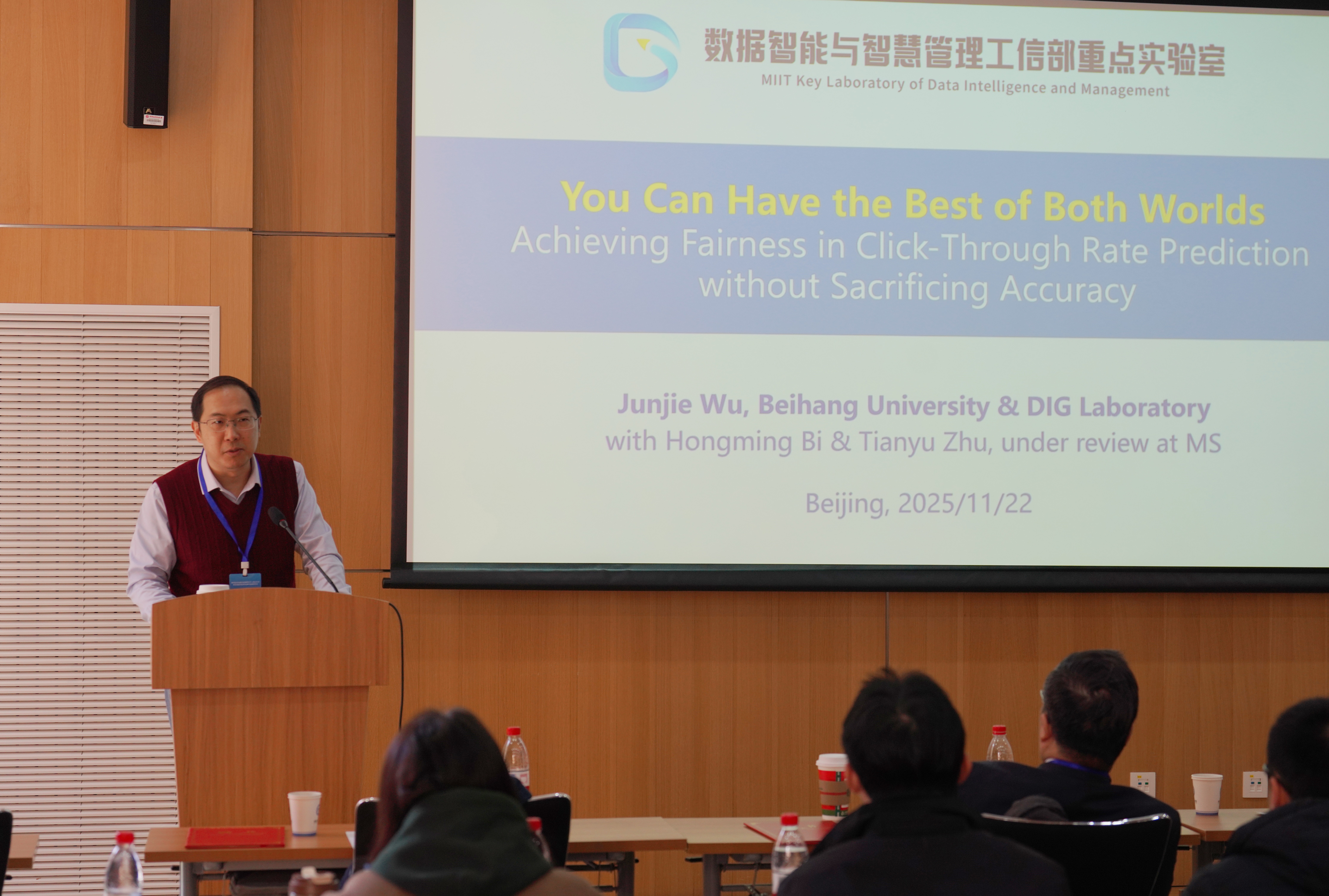 北京航空航天大学吴俊杰教授作了题为“鱼与熊掌可以兼得:公平且有效的推荐算法研究”的报告,将“不可能三角”困境转化为序贯优化过程,提出了一种兼顾预测公平性和准确性的推荐算法框架。