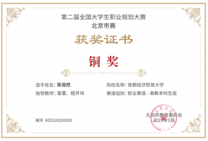 学院围绕生涯教育主线,推进“招生—培养—就业”联动机制,学院2022级大数据科学与技术专业本科生陈菲然获全国大学生生涯规划大赛北京市赛中获就业赛道铜奖,2022级计算机科学与技术专业本科生钱天鹤获优秀奖,2023级计算机科学与技术本科生丁邵帅获成长赛道优秀奖,实现了参赛覆盖率超过60%,形成“以赛促学、以赛促练、以赛促就”的良好氛围,推进在校生将生涯发展理念与学科认知、专业学习、实习实训深度融合,让在校生设计自己的生涯发展路径,将精准生涯指导覆盖“从入学到毕业”的全过程。