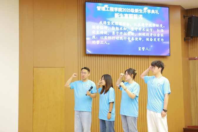 全体新生庄严宣誓,将坚定理想信念,认真遵守规章制度刻苦钻研,勤勉求知,坚守学术诚信;弘扬优良传统,勇于开拓创新,积极投身社会实践;以实际行动践行青春使命,做奋发有为的管工人。