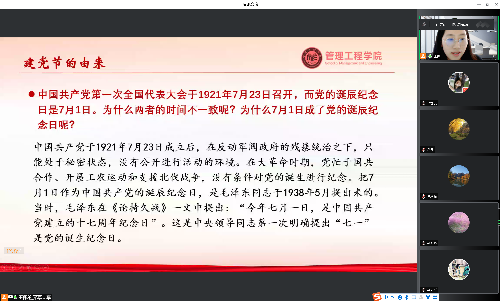 最后,王佩分享了一个共产党成立的历史纪录片供大家学习。视频内容引发了老师们的爱国热情,纷纷在聊天区发表意见。此次活动让大家进一步了解了中国共产党的历史,也通过邓恩铭的事迹使大家深受启发,决心在教学工作中持续挖掘课程思政元素,认真落实立德树人的根本任务。